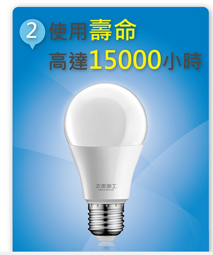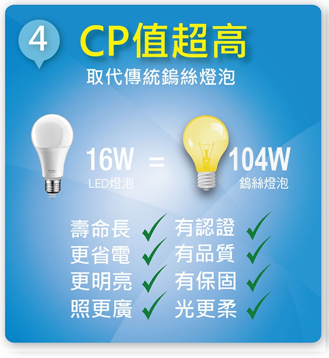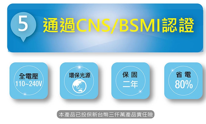 Ac110~220V使用功率:16瓦 照度:100瓦 光照:柔白光 通過CNS驗證 節能省電 使用台灣晶電LED芯片 全鋁散熱 長壽命25000小時 全電壓100V~240V適用 保固二年 使用安全有保障 300度廣角照明 無汞無藍光紫外線及紅外線◆商品特色1. 通過CNS/BSMI驗證,節能省電。2. 使用台灣晶電LED芯片。3. 使用全鋁散熱,增加使用壽命高達25000小時。 4. 300度廣角照明,照明區域更廣。 5. 保固二年,使用安全有保障。 6. 全電壓,適用AC100-240V電壓。 7. 環保不含汞,降低環境污染。 8. 等同110W鎢絲燈泡,高效能、高品質,有效節省電力80%以上。 9. 一點即亮,護眼不閃爍。 10.光生物安全認證,無藍光紫外線及紅外線光傷害。11.已投保新台幣三仟萬產品責任險。