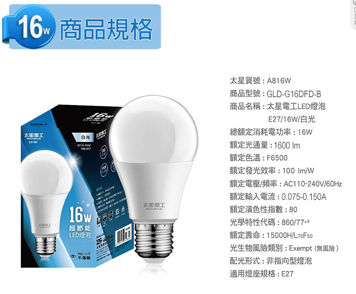 光禾館 太星電工 E27 16Wf LED省電燈泡