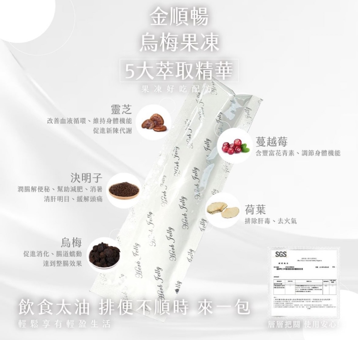 成分: 純水、半乳寡糖夜、蔓越莓濃縮汁、可溶性纖維、荷葉萃取物、烏梅萃取物、天然酵母B群、靈芝萃取物、膠體(洋菜粉、蒟蒻葡甘露聚醣、刺槐豆膠、玉米糖膠(黏稠劑)、鹿角菜膠(黏稠劑)、決明子萃取物、檸檬酸、蔗糖素。